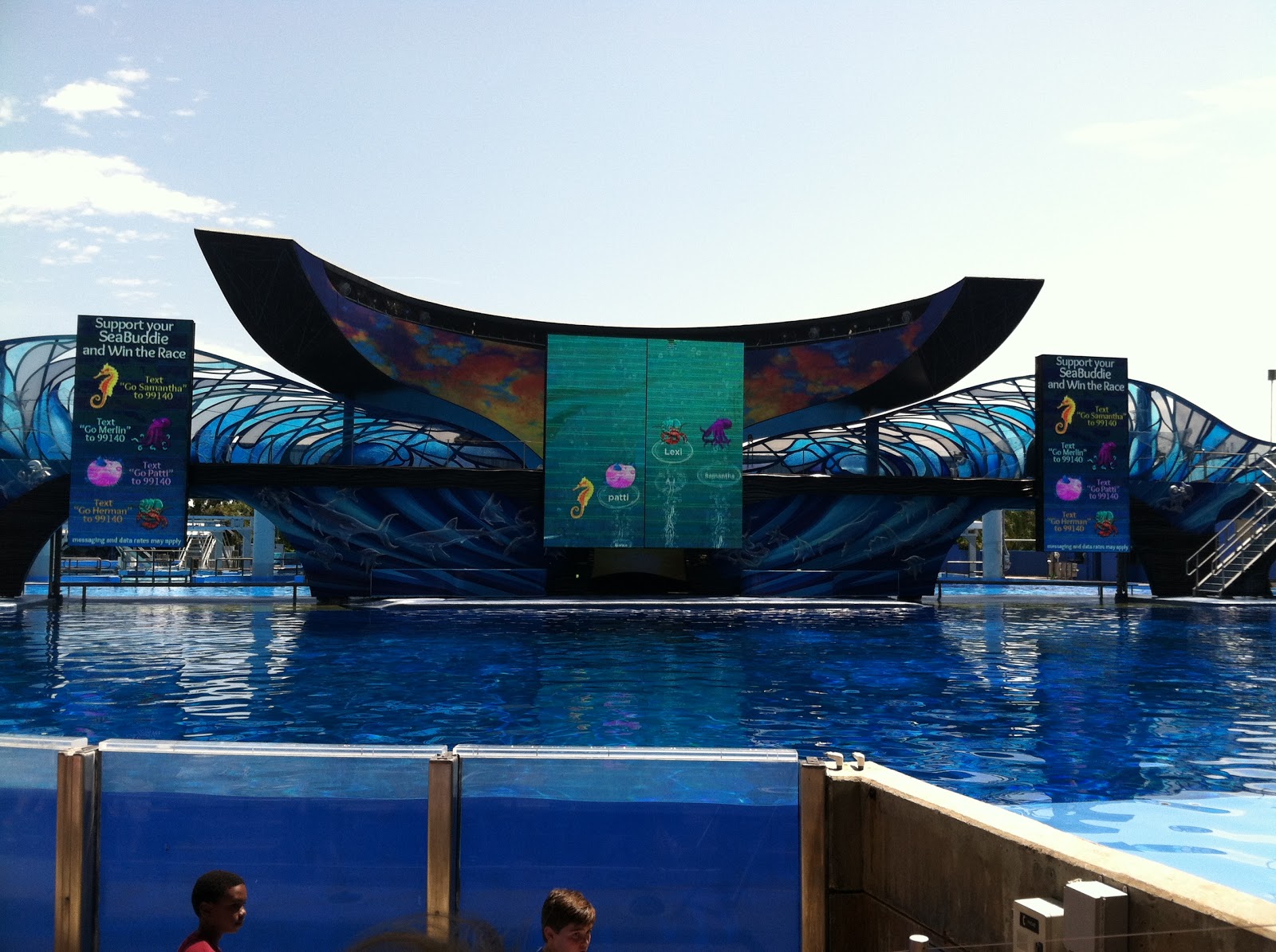Other sea life we saw included manatees, rescued sea turtles, beluga whales, walrus, sharks, and a lot of fish. Of course, we can't forget the Orcas in the Shamu show, One Ocean. We arrived to the show just in time, and somehow were able to snag two spots right near the front of the amphitheater! Sure, we were in the Splash Zone, but how wet could we get? Apparently, very! The first minutes were the whales doing cool flips and sliding on the stages, which was tame and splashed just a little, but not enough to reach our row. Not bad, we thought. Next thing we know, though, the screen lit up flashing "Splash Time"; Kaitlyn ran from our row up to the top of the section out of the splash zone, but I decided I would see how bad it was (can't be too wet, right?). TIDAL WAVE. I quickly followed right after her! It was a great show though!